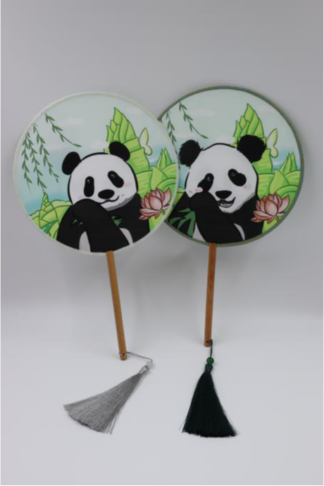春生香果雙面團扇邊框以溫婉的江南煙青色為主色調,扇面圖樣由西湖標志的柳枝、荷花,結合園內人氣動物熊貓“春生”和“香果”手繪像組成,扇柄搭配流蘇掛件,組成這款獨具特色的“漢文化+卡通”的工藝團扇。